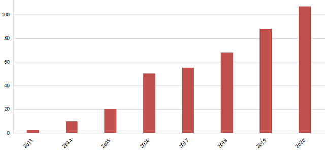 betway88西汉姆联2013年-2020年专利申请数量(单位:件)