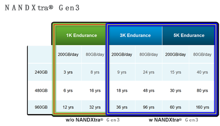 长期的测试结果显示,在NANDXtra® Gen3可靠性引擎的加持下,闪存颗粒平均使用寿命整体提升3到5倍,为采用QLC颗粒的SSD企业以及搭载使用QLC颗粒SSD的整机企业免去后顾之忧。