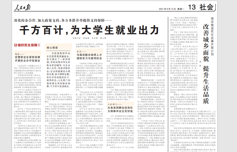 深化校企合作、加大政策支持,各方多措并举提供支持保障—— 千方百计,为大学生就业出力 (做好民生保障⑤) 本报记者 祝佳祺 王云娜 李心萍 《人民日报》( 2021年09月13日 第 13版) 核心阅读 为促进高校毕业生实现更高质量就业,各方推出了一系列举措:学校加强对学生的职业规划辅导,与企业深入合作,创造求职机会;企业积极推动与高校共建,参与课程设置,有针对性地提供实习、留用机会;人社部门加强政策支...